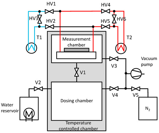 Figure 3 shows a schematic drawing of the recently-modified kinetic setup at Fraunhofer ISE in which both large pressure jump measurements (LPJ) as described by Schnabel et al. [8] and Füldner et al. [19], as well as large temperature jump measurements (LTJ) as described by Aristov et al. [15] can be performed. A brief description of the current setup was given earlier [22]. The basis for the setup was described first by Schnabel [18] and Schnabel et al. [8]. The recent modification is the connection of a nitrogen dosage unit. If both the measurement chamber and the dosing chamber are evacuated, the vacuum pump is switched off. Then, both chambers can be filled with dry nitrogen by opening of the valves V3, V4 and V5. The pressure in the measurement chamber and the dosing chamber is measured with two separate pressure sensors (Baratron 627B (MKS Instruments, Andover, MA, USA)). The surface temperature of the sample placed in the measurement chamber is measured with an infrared sensor (Optris CT Fast (Optris, Berlin, Germany)). In order to indicate the measurement of the surface temperature with the infrared sensor, we call the measurements IR-LPJ and IR-LTJ in the following. The temperature of the thermostats T1 and T2 is measured with Pt-100 sensors. Furthermore, the vapor temperature in the dosing chamber is measured with two Pt-100 sensors. As a prerequisite for each measurement, the measurement chamber with the sample inside is fully evacuated. The carrier plate is heated to a maximum value of 95 °C while the vacuum pump stays connected to the measurement chamber. These conditions are kept over 4 h to make sure that all water vapor or gas is desorbed from the sample.