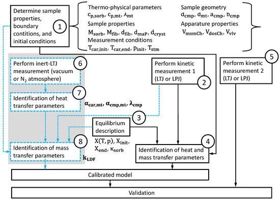 For the new measurement and simulation procedure, three more steps (6, 7 and 8) are suggested in order to separate the identification of heat transfer parameters from the identification of mass transfer parameters. The heat transfer parameters are identified by fitting simulation data to the experimental data of an inert-LTJ experiment (Step 6). This kind of experiment can be compared to flash analysis as first presented by Parker et al. [34] or other methods that are suited to determine heat transfer parameters. It is worth noting that also in the field of air-to-air energy wheels that are used for air dehumidification, kinetic measurements (temperature jumps or humidity jumps) are performed in order to determine model parameters [30,31]. Here, it could also be an option to perform inert temperature jumps in order to study only the heat transfer characteristics without the influence of the adsorption material.