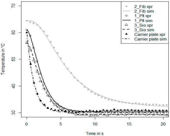 For all measurements, the inert LTJ experiment and simulation are in very good agreement as shown in Figure 5. The identified heat transfer parameters are listed in Table 7 and Table 8. For this parameter identification, we used the models 1_Plt_inertLTJ, 2_Fib_inertLTJ and 3_Sio_inertLTJ as listed in Table 4.