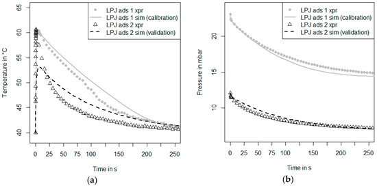 The model calibration is done by the variation of unknown parameters. For each calibration measurement, the set of unknown parameters is varied, and the RMSD and the CV are evaluated. The objective function for the calibration is shown in Equation (21). The weighting factors are chosen and in the case of the IR-LPJ and IR-LTJ measurements. For the inert-LTJ measurements, the objective function is calculated with and , since there is no pressure signal in these measurements.