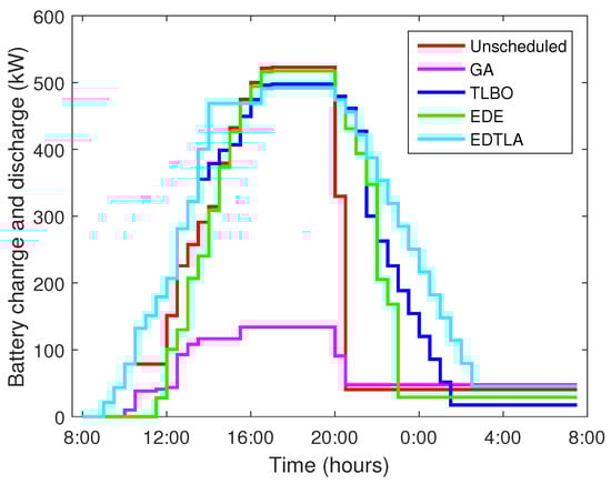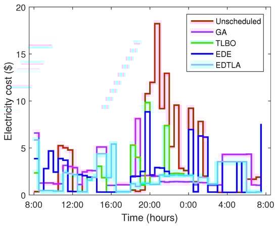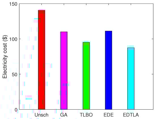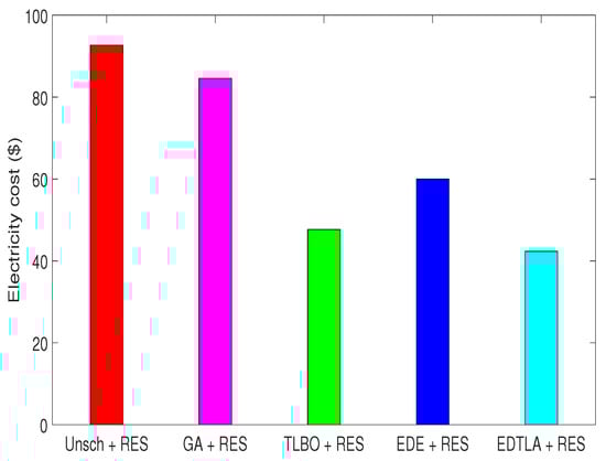 Figure 14 shows the comparison of the hourly power consumption cost of the aforementioned techniques without the integration of BSS and RESs. EDE shows some spikes; however, their impact on total cost is negligible because these spikes last for one or a couple of low price time intervals. GA has a maximum of an 8 $ cost in any single time interval, which is adequately less than the unscheduled case. On the other hand, TLBO has a flat curve during the whole day, because it utilizes low price hours. Initially, all techniques show an average behavior towards cost; however, TLBO increases drastically later when there is a low price hour, but only for one time slot. EDE and GA schedule appliances in high peak hours, which consequently decrease the waiting time, but at the cost of the increased consumption expenditures. EDE does not schedule appliances during time slots 10–20, which as a result creates a peak later in the high price time slots; due to which, EDE has the highest total electricity cost among the four techniques, as can be seen in Figure 15. GA and EDE have comparable costs of consumption; however, GA performs slightly better. Our proposed EDTLA shows a flat behavior of power consumption throughout the day, so its power consumption cost is minimum among all algorithms in both cases. The total electricity bill for one day is 135.88 $, 116.37 $, 89.47 $, 118.66 $ and 82.14 $ in the case of unscheduled, GA, TLBO, EDE and EDTLA, respectively. The percentage reduction of cost in the two scenarios under all techniques is shown in Table 3 and Table 4.