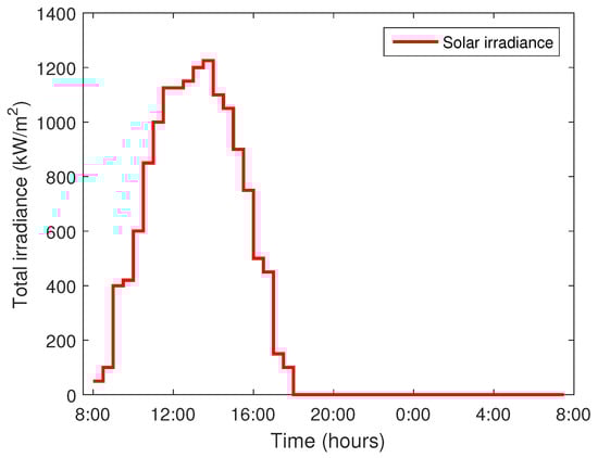 where o t p v is the output of the PV at time t, X d is the derating factor of the PV array, I S is the standard irradiations (kWh/m 2 ) and K p shows the temperature coefficient (%/°C). The Meteonorm software is used to calculate the radiations on a PV panel of tilt angle 30°, which is considered as the optimal direction for PVs. Generically, if the temperature remains within the limits of 16–36 °C throughout the day and the area of the PV is 200–220 m 2 , then the output power on a typical sunny day would be roughly 500 kW. Moreover, the partially sunny and cloudy days will have 200–300 and 50–70 kW of generation, respectively, under similar conditions.