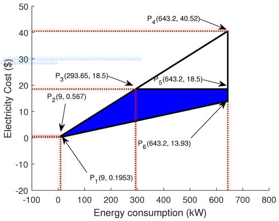 The feasible region of the objective function is shown in Figure 8, which is comprised of six points. The first point P 1 ( 9 , 0.1953 ) is the electricity cost where the minimum load (9 kW) coincides with the minimum price time slot. Similarly, point P 2 ( 9 , 0.567 ) shows the consumption cost when the minimum load is scheduled in the maximum price time interval. If all appliances are ON in a time interval of maximum price, then the electricity bill is shown by point P 4 ( 643.2 , 40.52 ) . Conversely, P 6 ( 643.2 , 13.93 ) represents the cost if all appliances are ON in the minimum price time slot. As also mentioned in Section 4, the power consumption is equal to the power rating and status of an appliance at a particular time interval, whereas the electricity cost depends on the power consumption and the price of electricity at that time interval. The RTP signal is announced by the utility, so the power consumption pattern of appliances is modified to reduce the electricity bill. Moreover, in any time slot, the maximum cost of the scheduled case must not exceed the maximum cost of the unscheduled case. Points P 3 ( 643.2 , 13.93 ) and P 5 ( 643.2 , 13.93 ) show the bounding limits on the maximum load and cost, respectively. The four possible cases of electricity cost are: (i) minimum load, minimum price, (ii) minimum load, maximum price, (iii) maximum load, minimum price, and (iv) maximum load, maximum price.