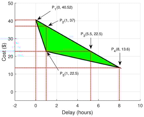 The feasible region of tradeoff between electricity bill and delay is shown in Figure 9. The feasible region consists of five points. P 1 ( 0 , 40.52 ) shows a point when there is no delay and all appliances run with high priority. The point P 4 ( 8 , 13.6 ) shows that if we shift our appliance up to 8 h, we pay only 13.6 $ instead of 40.52 $. In our scenario, one hour is the minimum time delay in which a 22.5 $ cost is incurred, as can be seen at point P 5 ( 1 , 22.5 ) , which is much better than the unscheduled case. Similarly, P 2 ( 1 , 37 ) represents the cost with a similar delay of one hour when appliances power on in a high price hour. If high price hours appear consecutively, then appliances may have to wait for a maximum time of 5.5 h to achieve a similar cost, as depicted by P 3 ( 5.5 , 22.5 ) .