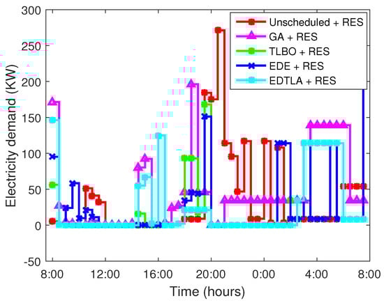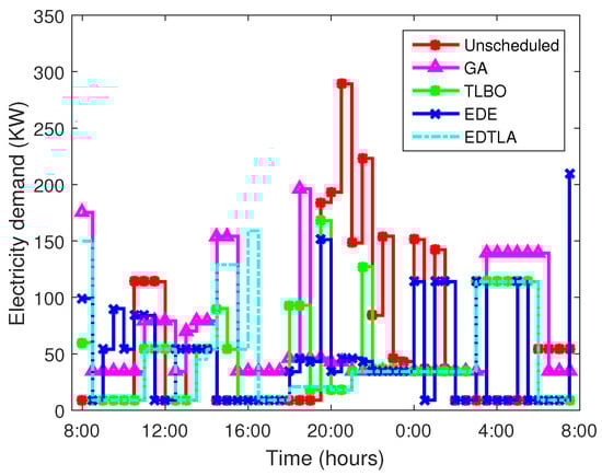 Figure 11. Hourly electricity demand. Teaching learning-based optimization (TLBO); enhanced differential evolution (EDE); and enhanced differential teaching learning algorithm (EDTLA).
