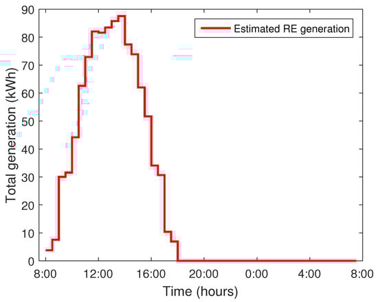 Additionally, Table 3 shows the total carbon emissions of one day when the total energy is imported from the main grid. In the aforementioned case, there is no RE, and the whole electricity demand is entertained by the main power grid. The smart residential complex generates its own electricity to meet daily electricity demands. When we integrate RE, the power demand curve under all cases becomes flatter, as shown in Figure 12. Half of the total power demand is assumed to be generated by local RESs of the residential complex. Figure 13 shows an estimated RE generation on the simulation day. Most of the appliances are scheduled when adequate RE is available. Excess RE is stored in BSS and used later when there is no local energy generation or a high electricity price at the grid. There is no or very low electricity demand in the initial hours of the day due to the availability of local energy, particularly in the case of TLBO and EDTLA. Consequently, RE integration contributes to lowering the electricity bill and a flat PAR. EDTLA has shown the best demand curve in both cases with minimum electricity demand from the main power grid. During the whole day, when the price is high, EDTLA has no electricity demand from the grid. EDTLA satisfies load demand from local generation and BSS when there is a peak at the grid side. EDE does not perform better in terms of hourly power demand as compared to GA; however, when RESs are integrated, EDE has a lower electricity bill. This is because of the low power demand in high price hours. From the above results, it can be seen that EDTLA has a more appropriate and flat demand curve among all algorithms. Similarly, Table 4 lists the percentage decrease in carbon emissions when RESs and BSS are incorporated. It is proven that integration of RESs leads to significantly lowering of the carbon emissions and other harmful gasses.