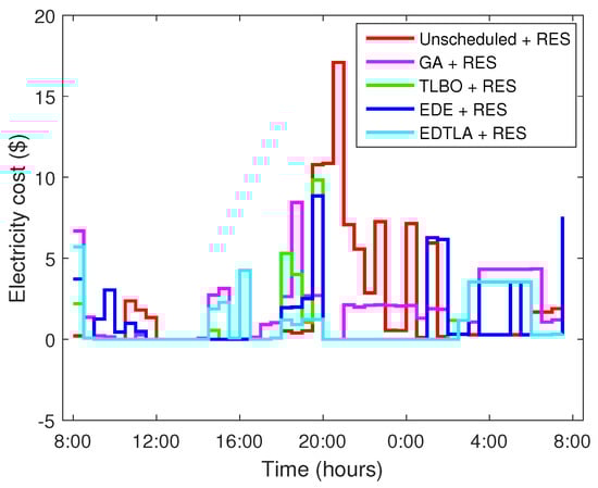 In the second scenario, where RESs and BSS are also available, the maximum cost in one time slot decreases to 9 $ in the case of TLBO. This decrease is due to the discharge of BSS when the peak occurs at the grid, as also shown in Figure 4. On the other hand, the maximum cost in one time interval remains the same under GA and TLBO because the RE and BSS are used in high price hours (i.e., 24–27), where all techniques have nearly zero cost of electricity from the grid. Figure 16 depicts the hourly cost of electricity obtained from the grid after using local RESs and BSS. Total per day cost in both cases (with and without RESs and BSS) is shown in Figure 15 and Figure 17, respectively. The total electricity bill for one day is 92.63 $, 84.24 $, 48.11 $, 62.21 $ and 44.83 $ in the case of unscheduled, GA, TLBO, EDE and EDTLA, respectively, when RESs and BSS are also available. EDTLA performs better in terms of cost with a reduction of 8% in the total electricity bill as compared to TLBO and 36% as compared to the unscheduled case. From the above figures and facts, the impact of RESs and BSS can easily be noted, and with a small one time investment on RESs and BSS, the user can reduce the electricity bill and PAR. The summarized results are also shown in Table 4.