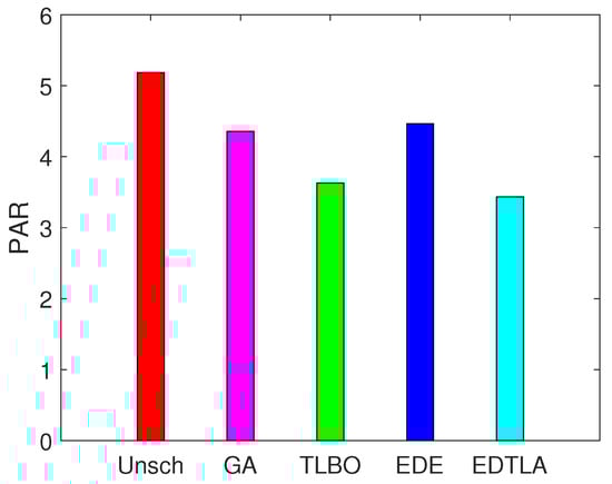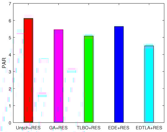 The performance of four different heuristic techniques assessed in terms of PAR is shown in Figure 18. It is clear that scheduling with GA, TLBO, EDE and EDTLA leads towards low PAR as compared to the unscheduled case. When RESs and BSS are integrated, the peak at any hour is reduced up to a significant level; however, PAR becomes high, due to very minimal average load at the grid. The major portion of load is shifted to RESs, and approximately half remains on the grid side. Peak load remains the same in GA and TLBO when RESs are integrated; whereas, the average load becomes flat. Therefore, the PAR shows an increasing trend when RESs are added, as can be seen in Figure 19. When peak demand occurs at the grid side, BSS is used at the consumer premises to reduce the load at the grid side. The battery is charged when the RE is available and discharged later when no RE is available, as shown in Figure 4. The EDE has the highest PAR among the scheduling algorithms because it creates several small peaks in low price hours, as also shown in Figure 11. GA creates a moderate peak, so it shows moderate PAR.