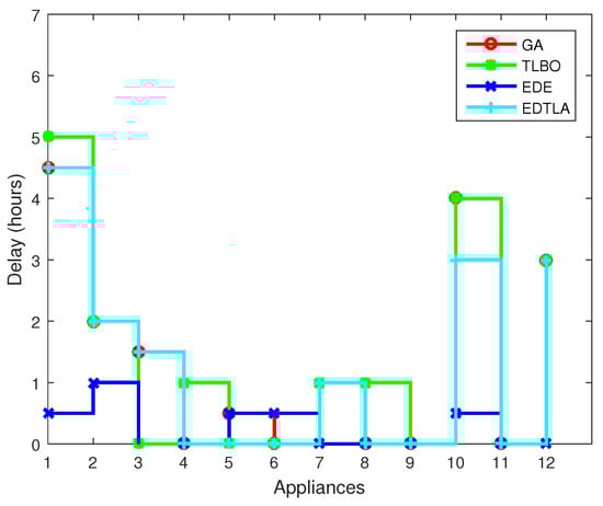 User discomfort is calculated in terms of the time delay of appliances from the given earliest starting time window. A tradeoff is always seen in user comfort and electricity cost, described later in the upcoming subsection. The electricity bill shows a decreasing trend with a compromise on comfort, and opposite case is also true. Figure 20 shows the waiting time of all appliances under four different heuristic techniques. It can be clearly seen that EDE has minimum delay, which means least discomfort, however at the cost of a huge electricity bill, as depicted in Figure 15. Most of the appliances do not wait to execute in the case of the EDE algorithm. GA and TLBO have comparable waiting time and appliances, which allow one to shift time intervals, wait and contribute to the electricity bill reduction. EDTLA has more waiting time than the TLBO technique, which is mainly due to convergence towards the global optimal solution. TLBO schedules appliances as it finds the minimum price time slot; however, our proposed technique completely searches all possible solutions and then schedules accordingly. When we integrate RESs and BSS, there is no direct impact on user comfort in terms of delay; however, the user is satisfied when the electricity bill shows a decreasing trend. In the unscheduled case, appliances run whenever they are required, regardless of the cost and grid stability concerns, so no user comfort is calculated in the unscheduled case.