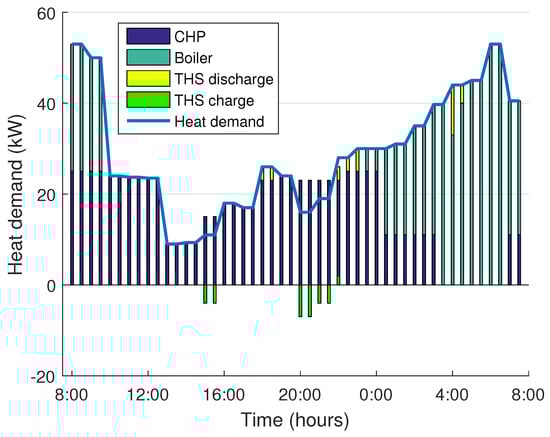 Figure 21 presents the heat balance for smart building. Heat is provided by using local resources of the smart building, which consequently decrease global carbon emissions. The heat demand curve has two peak demands: first, early in the morning; and the other is later, when the temperature becomes low. During these peak hours, the CHP generator constantly works at full capacity due to more heat demand, and the rest of the heat is either provided by thermal storage or the boiler. The boiler starts generating more heat to fulfill the demand when the price becomes flat and no heat is harvested from the CHP generators. CHP does not generate excess power unless and until the generated heat is utilized or saved in storage. Thermal storage works as a heat backup and cannot save more heat than its designed storage capacity. Storage is charged when excess power is available and discharged when required. Since the heat demand curve is given, only resources are scheduled in this case in order to lower the carbon emissions and total payable expenditures.