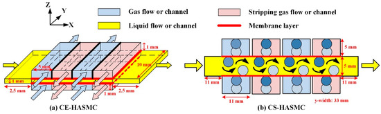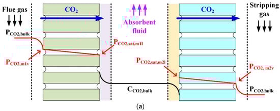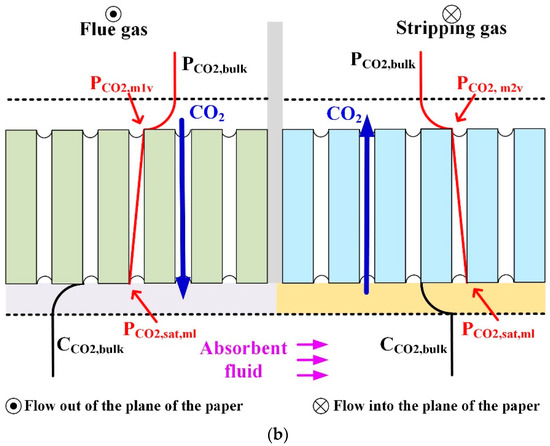 The mass transfers inside parallel-flow and cross-flow HASMCs are illustrated in Figure 4. In the parallel-flow configuration, as shown in Figure 4a, the absorption membrane and the stripping membrane are located on opposite sides of the absorbent liquid. In the cross-flow configuration, as shown in Figure 4b, the absorption membrane and the stripping membrane are adjacent to each other and allocated on the same side of the absorbent liquid. In the parallel-flow configuration, the concentration boundary layers at the absorption and stripping membrane boundaries are separated by the bulk liquid. Differently, in the cross-flow configuration, the concentration boundary layer of the absorption section is followed by that of the neighboring stripping section.