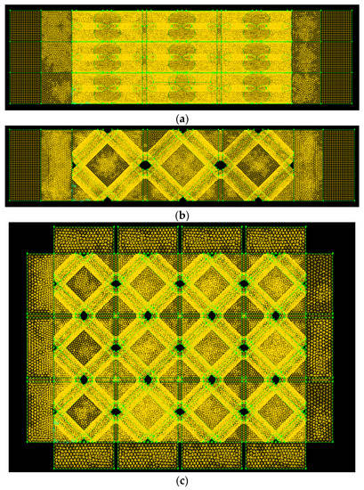 Computational grid for CFD simulation of HASMCs with spacers (a) parallel-flow (side view), (b) parallel-flow (top view), (c) cross-flow (top view)).