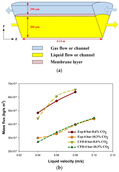 Model verification using experimental data from [25]: (a) simulation system; (b) comparison of simulated and experimental transmembrane CO2 mass flux.