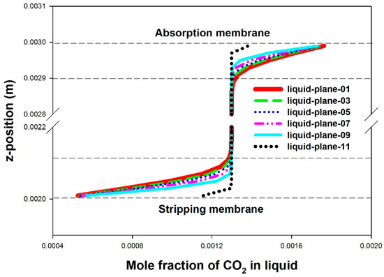 For the BC of PE-HASMC, the liquid channel carbon dioxide concentration profiles are shown in Figure 7. The absorption and stripping concentration boundary layers are independent and separated by the bulk liquid. With this characteristic, PE-HASMC cannot provide the anticipated effect of enhancement of the absorption and stripping mass transfer by simultaneous absorption and stripping within one module.