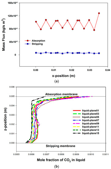 For the BC of CS-HASMC, the mass fluxes in the liquid flow direction, shown in Figure 11a, vary in a fluctuating pattern corresponding to the spacer configuration. The stripping fluxes are higher than the absorption fluxes. Both absorption and stripping fluxes decrease along the flow direction but the change of the stripping flux is more significant. These outcomes are due to the higher mass transfer driving force in the stripping operation. The variations of liquid concentration at membrane surface in the liquid flow direction, as shown in Figure 11b, are similar to the profiles shown in Figure 11a.