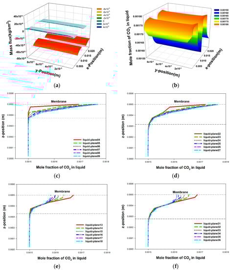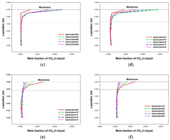 CE-HASMC BC internal profiles ((a) transmembrane CO2 mass flux, (b) membrane surface liquid CO2 concentration, (c) first absorber (liquid entry: liquid-plane04), (d) second absorber (liquid entry: liquid-plane22), (e) first stripper (liquid entry: liquid-plane13), (f) second stripper (liquid entry: liquid-plane31), (c–f) CO2 concentration profiles in liquid channel).