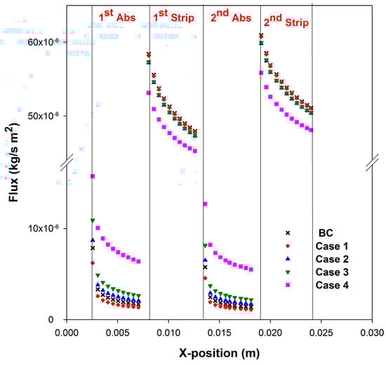 The profile of liquid concentration at membrane surface, as shown in Figure 9b, reveals the concentration increase in each absorption section and the concentration decrease in each stripping section along the liquid flow direction. The internal concentration profiles of the liquid are revealed in Figure 9c–f. For both absorption and stripping, the thickness of the concentration boundary layer of the second section is greater than of the first one. The effects of liquid velocity and the liquid diffusivity on mass flux are shown in Figure 10. Note that the stripping flux is presented as positive value in this figure. Comparing BC and Cases 1–3, the higher the liquid velocity, the higher the absorption flux because the concentration can be maintained at lower levels. However, the effect of liquid velocity on the stripping flux is reversed because of the same reason. Comparing BC and Case 4, raising the liquid diffusivity by ten times (Case 4) can significantly increase the absorption flux and decrease the stripping flux. Both effects are caused by the lower membrane surface concentration due to higher diffusivity.