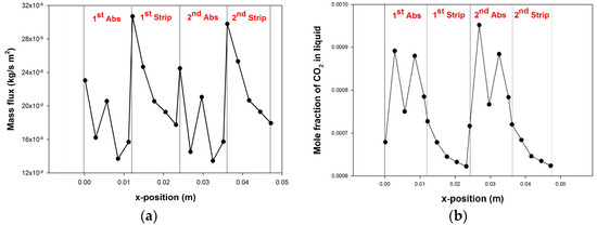 For the BC of CE-HASMC, the transmembrane CO2 mass fluxes for the two absorption sections and two stripping sections are shown in Figure 9a. Note that the stripping mass flux is presented by negative value in this figure. For each of the four channels, affected by the liquid concentration change after absorption or stripping, the mass flux decreases along the flow direction of liquid (x-direction). For both absorption and stripping, the fluxes of the first and the second channels are close. This result indicates the cross-flow module can effectively refresh the liquid for the second absorption following the first stripping.
