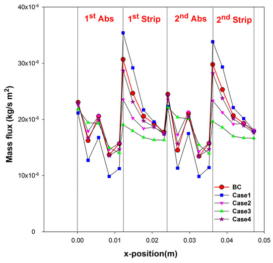 For CS-HASMC, the effects of liquid velocity and the liquid diffusivity on mass flux, as shown in Figure 12, are similar to that of CE-HASMC. Comparing BC and Cases 1–3, the higher the liquid velocity, the higher the absorption flux because the liquid concentration can be maintained at lower level. However, the effect of liquid velocity on the stripping flux is reversed because of the lower liquid concentration. Unlike in CE-HASMC, comparing BC and Case 4, the increase of mass flux by raising the liquid diffusivity by ten times (Case 4) is limited. This is because the use of spaces has provided substantial enhancement of diffusion effect.
