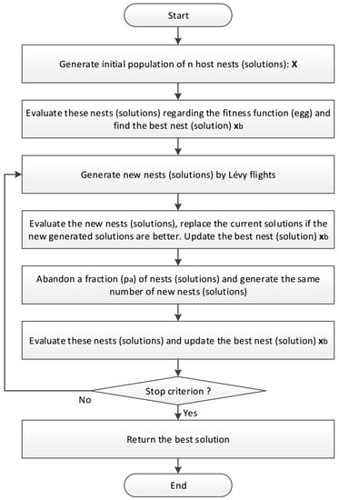 Cuckoo Search was first proposed in 2009, inspired by the breading behavior such as brood parasitism of certain species of cuckoos []. CS attracted considerable attention and has been successfully applied to solve different optimization problems in different areas. The flow chart of CS is shown in Figure 1. The principles of the cuckoo search algorithm can be described as follows: