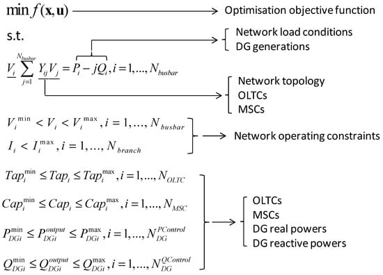 For distribution networks, voltage control is used to utilize the available voltage control devices and to ensure the network operation is within the statutory voltage limits and thermal limits. Additional objectives, such as reducing network losses, can also be achieved by setting the control devices properly. One approach is to formulate and solve the voltage control problem as an optimal power flow (OPF) problem; the formulation of which is well known and can be found in previous studies, such as [,]. The details of the problem formulation could vary with different networks and control preferences. In the following, the impacts of the development of distribution networks on the problem formulation are discussed.