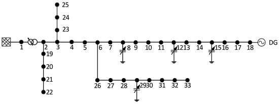 The 33-bus case study network, referred to as Network A, has an OLTC transformer and five MSCs integrated into the original network as shown in Figure 4. The OLTC is placed between busbars 1 and 2, with eight tap positions from 0.95 to 1.05 in per unit, with a step size of 0.0125. Four MSCs are connected to busbars 8, 12, 15 and 29. Each MSC consists of six modules with 50 KVAr per module. A single DG is connected to bus 18 in the future scenario. The installed capacity of this DG is assumed to be 4 MW.