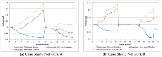 The case study network busbar voltages before the voltage problem algorithms have been applied are shown in Figure 6.