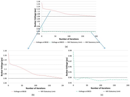 Various optimization algorithms have been proposed in previous research to solve voltage control problems, which can be classified as deterministic or metaheuristic algorithms []. In [], the primal-dual interior-point (PDIP) algorithm was applied to solve the reactive power and voltage control problems. The voltage control problem was formulated as a mixed integer nonlinear optimization problem (MINLP), and network loss minimization was defined as the optimization objective. In [], the oriented coordinate descent method (ODCDM) was applied to solve the distribution network voltage control problem. The voltage control problem was formulated as a combinatorial optimization problem, and network loss was also minimized. The deterministic algorithms can provide deterministic answers and they are computationally efficient. Some of them have been successfully implemented within real distribution networks, such ODCDM []. However, they can only guarantee local optimal solutions for non-convex optimization problems []. In addition, they are not designed for mixed-integer problems, although some methods have been previously proposed to facilitate the application of deterministic algorithms to solve mixed-integer problems. For example, the PDIP algorithm was applied to solve the mixed-integer problems in [], by modelling the discrete control variables as continuous variables, and introducing a penalty function to force the discrete control variables to converge to their feasible values. However, the introduced penalty function increases the risk of converging to a local optimal solution or even an infeasible solution.