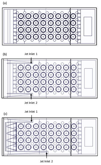 In addition to the inlet plenum, jet inlets were added to the sides of the battery pack (Case 2), presented in Figure 2b. As shown in Figure 1a, the air enters from the inlet plenum after the fourth column of cells. As a result, the air from the jet inlet was introduced into the space between the second and the third column of cells (see Figure 2b). The jet changes the airflow dynamics, and significantly minimizes the problem of recirculation and dead air regions between the adjacent cells.