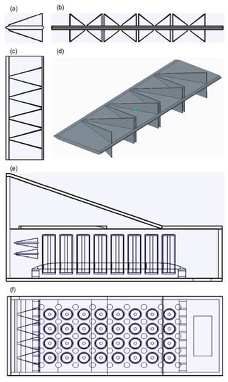 In order to increase mixing within the battery pack, a vortex generator was developed. Multiple delta winglet vortex generators were placed onto a thin plate. To increase the number of vortices generated, the delta winglet vortex generators were mirrored to the bottom of the plate as well. This developed vortex generator is known as the multiple vortex generator (MVG), and is shown in Figure 3. For this study, a configuration was developed in which two MVGs were placed at the front of the cells near the inlet as shown in Figure 3e,f. This is called Case 3.