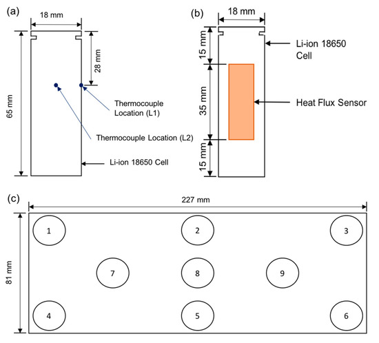 (a) Thermocouple placement locations at the leeward side of the battery; (b) front view of heat flux sensor placement location; and (c) front view of velocity measurement locations at the inlet.