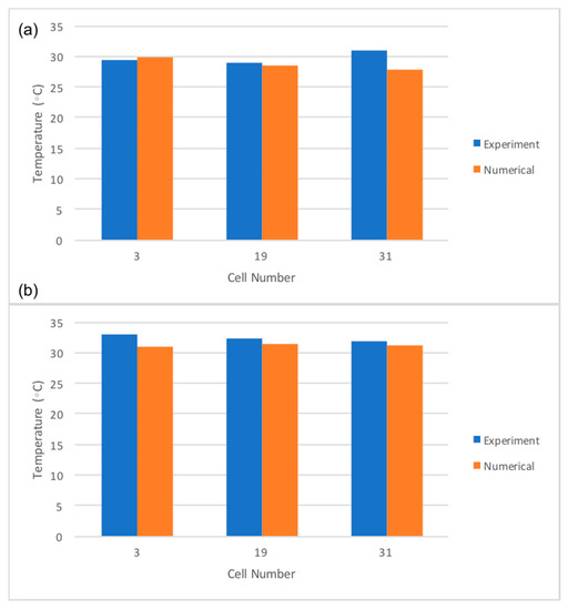 Due to the limited capacity of the charger/discharger, only one cell at a time was tested. As a result, three cells were selected randomly for the experiments, which include the cells numbered 3, 9, and 31 as indicated in Figure 1b. The temperature measurements obtained for these cells at locations L1 and L2 from the experiments (Figure 5a) were compared with the temperature results attained from the simulations at the same locations. The validations are shown in Figure 7, and the temperature differences between the compared results are provided in Table 5. There is an average temperature difference of 1.1 °C between the experiments and simulations, which agrees with the temperature validations in the open literature [21]. Therefore, it can be concluded that the numerical results are consistent with the experimental results.
