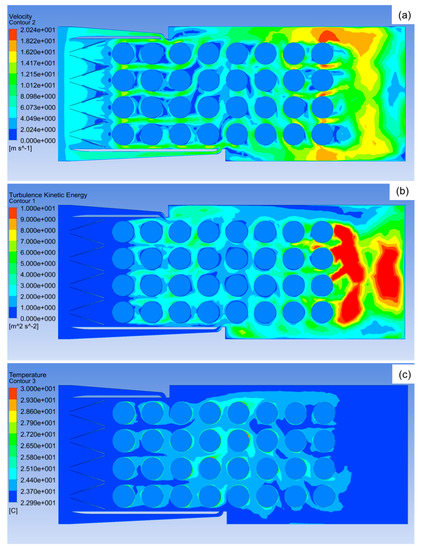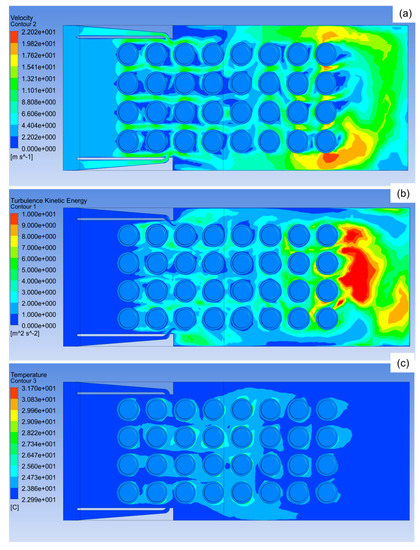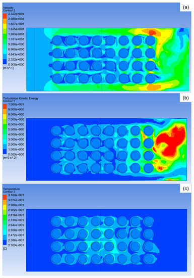 It can be noted from Table 6 that there are minute differences in the maximum temperatures and average maximum temperatures of Case 2 compared to Case 1. The temperature difference of Case 2’s configuration increased by only 2.66%, and the average temperature difference of all the cells increased by 3.13%. The contours of velocity, turbulence kinetic energy, and temperature are also shown in Figure 8.