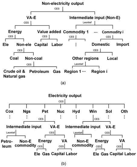 Structure of production for non-electricity and electricity sectors: (a) non-electricity sectors; (b) electricity sector.