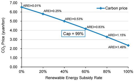 CO2 price changes under different RES subsidy rate. (AREI denotes annual renewable energy ratio increase).