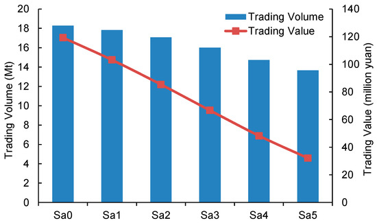 A lower CO2 price will affect inter-regional carbon trading, particularly trading volume and value. Figure 6 shows the total trading volume and value of the nationwide carbon market under scenarios Sa0 to Sa5. While the RES policy promotes the development of renewable energy, the demand for emission allowances weakens within the electricity sectors, thus reducing the trading volume of the existing nationwide carbon market. According to our estimation, the total trading volume decreases between 3% and 25% at RES subsidies ranging from 20 to 100%. The total trading value experiences larger decrease with the decreasing CO2 price. The results show that the annual trading value of the nationwide carbon market is about 119 million yuan with an ETS policy alone. However, it decreases by 73% under scenario Sa5 (additional RES policy with 100% subsidy).