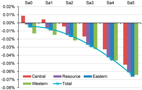 Figure 8 shows the regional GDP change in different scenarios. The adoption of an additional RES policy causes an increase in GDP costs in all regions, especially in central regions such as Shanxi, Heilongjiang, and Anhui. When there is only an ETS policy, GDP in central regions experience an increase of 0.01%. Most of the central regions are quota sale regions in the nationwide carbon market and can benefit from trading revenues. Our estimation shows that, although the resource regions and western regions are the main quota sale regions, their trading revenues cannot cover the GDP costs associated with excessive emissions reduction. Figure 8 shows that with the increase of the RES subsidy rate, the GDP change in central regions experiences a significant loss of 0.05% under Sa5, from an increase of 0.01% under scenario Sa0. For example, the GDP in Shanxi, a central region rich in coal with high potential for wind power [49,50], increases 0.078%, 0.058%, and 0.029% under scenarios Sa0, Sa1, and Sa2 respectively. GDP in Shanxi decreases by 0.006 to 0.094% under scenarios Sa3 to Sa5. The GDP in the eastern, western, and resource regions also present larger decreases under scenarios Sa1 to Sa5, as compared to Sa0. The GDP in eastern regions decreases the fastest with increasing RES subsidy.