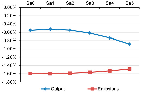 Figure 5 shows the CO2 price on the carbon market as influenced by RES policy under scenarios Sa0 to Sa5. With a higher renewable energy subsidy, the CO2 price decreases between 11% and 64%. When there is only an ETS policy, the CO2 price is 6.53 yuan/ton to achieve the reduction target. However, with an additional RES policy, it decreases to 5.79 yuan/ton, 5.00 yuan/ton, 4.17 yuan/ton, 3.28 yuan/ton, and 2.35 yuan/ton under scenarios Sa1 to Sa5 respectively. The results show that the higher the RES subsidy rate, the greater the CO2 price decreases. The lower CO2 price level indicates that if the emission allowances remain the same, the nationwide carbon market will provide fewer incentives for low-carbon investment under the additional RES policy. The RES subsidy in China is presently around 100%; at this level, our estimation shows that the CO2 price will decrease by 64%. Therefore, unless the RES subsidy is gradually phased-out between 2017 and 2030, the CO2 price on the nationwide carbon market will be affected significantly and, thus, the incentive of the nationwide carbon market to reduce emissions will be weakened. Alternatively, a tighter emission cap is needed during the 2017–2030 period to maintain a steady CO2 price.