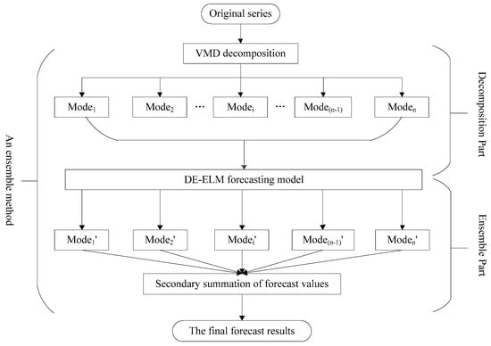 Based on aforementioned researches, the main novelties and contributions of this paper can be summarized to the following four aspects: (1) VMD technique is firstly applied to preprocess the electric load series in order to improve the overall forecasting accuracy; (2) VMD technique is combined with machine learning methods to develop a novel ensemble model for short-term electric load forecasting; (3) DE algorithm is employed to optimize the initial weights and thresholds of ELM in order to improve its function approximation ability; (4) the effectiveness of the proposed model is also examined by comparing with the forecasting models combining different decomposition techniques such as EMD and WT.