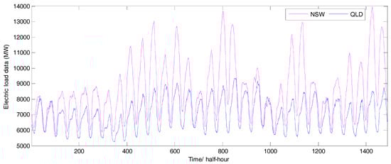 In this paper, two half-hour electric load series collected from NSW and QLD [34] are adopted to test the effectiveness of the proposed model. In Australia’s electricity market, there are 48 observation data points every day, which means the time gap of observation values is half an hour. In this paper, each electric load series contains 1488 observation data points (from 1 January 2017 to 31 January 2017), see Figure 2. Moreover, in each case, the 1st–1200th observation points are taken as training sets, and the rest, the 1201st–1488th observation points, are taken as testing sets. The descriptive statistics of the two electric load series is shown in Table 1.
