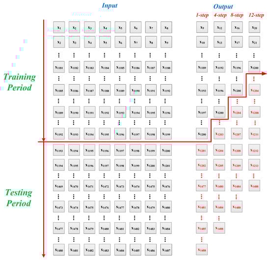 In order to make the forecasting results own more practical significance, this paper adopts multi-step ahead electric load forecasting. Compared with one-step ahead forecasting, multi-step ahead forecasting can supply more information for electricity market participants. Since multi-step ahead forecasting has to deal with many other additional complications such as the accumulation of errors, increased uncertainty and reduced accuracy [35], it is therefore more difficult to obtain precise forecasting results. This paper aims to propose an ensemble model for electric load forecasting over different horizons. Different horizons have different practical meanings. For instance, as for the half-hour data source, four-step ahead represents two-hour ahead, eight-step ahead represents four-hour ahead, and twelve-step ahead represents six-hour ahead. Furthermore, as shown in Figure 3, we take four-step ahead forecasting as an example to clearly interpret the multi-step ahead forecasting process. As shown in Figure 3, in the training process, the input and output datasets of DE-ELM model for four-step ahead forecasting are respectively and , and in the testing process, the input and output datasets of DE-ELM model are respectively and .