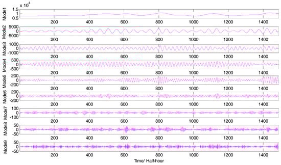 The electric load series is preprocessed using VMD in order to effectively decrease the stochastic fluctuations existing in the data series. Much previous research has shown that the number of components generated by VMD have significant effects on the characteristics of modes. In the decomposition process of VMD, more components will result in more stationary modes; however, more components might cause decomposition information loss and thus low forecasting accuracy. Based on the above considerations, after extensive numerical experiments, this study decomposes the data series into nine modes in order to ensure good forecasting accuracy. The decomposition results are shown in Figure 4 where the nine components are denoted by Mode1, Mode2, ..., Mode9, respectively.