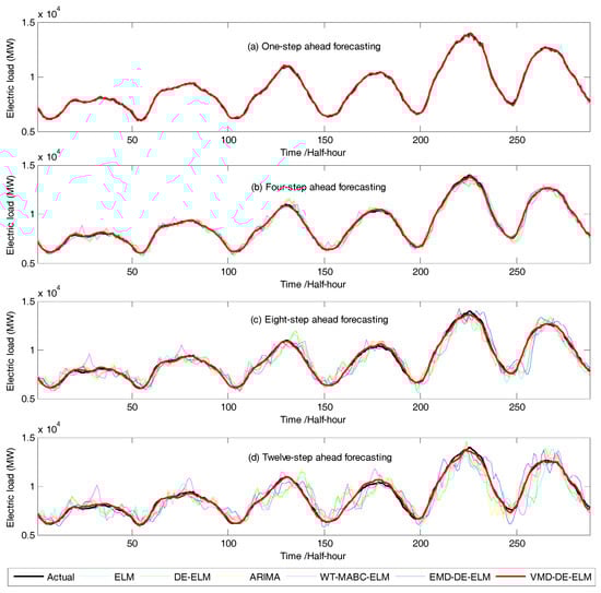In this section, the proposed model is tested using another real-world electric load series collected from QLD in order to verify its reliability and practicability. The forecasting results, including MAE, RMSE and MAPE values of all the models adopted in the paper, are provided in Table 4 and Table 5. Based on the results shown in Table 4 and Table 5, similar conclusions to that in the case of NSW are derived. It should be noted that because of different regional scales, population, geographical positions, climatic characteristics and industrial structures associated with NSW and QLD located in Australia, the two electric load series have significantly different complexities of irregularity, randomness and non-stationarity. In addition, the proposed VMD-DE-ELM model works only on the historical data series, consequently making different forecasting accuracies in the above two study cases. Nevertheless, all the experiment results in the two above cases can demonstrate the superiority of the proposed model.