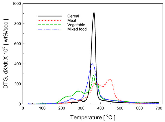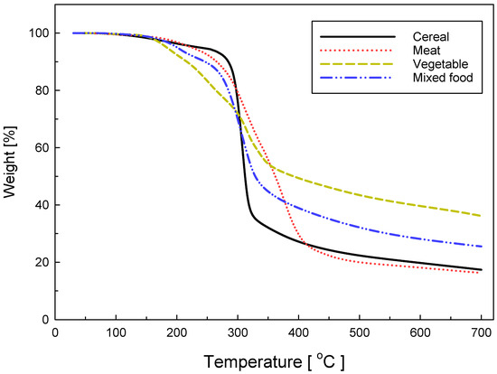 In the case of mixed food (Figure 5), pyrolysis started at about 150 °C and the most active pyrolysis occurs at 300–360 °C because various materials are mixed together. In the case of mixed foods, two peaks appear in the DTG curve, reflecting the fact that vegetable pyrolysis takes place at a lower temperature than pyrolysis of cereal and meat.