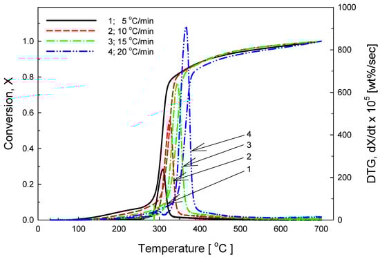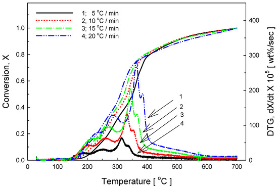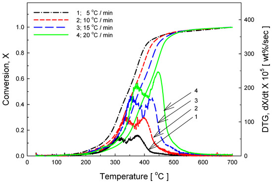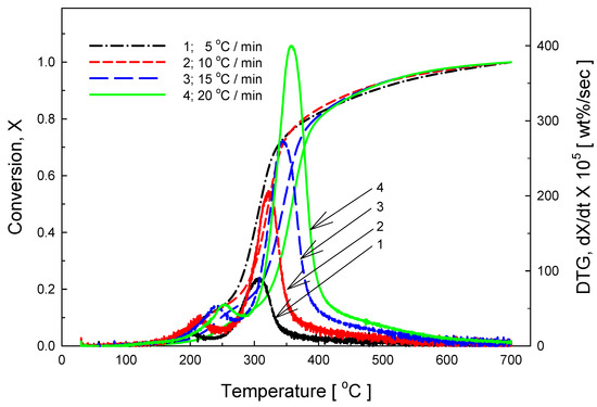 The conversion of the pyrolysis (Conversion, X) is based on the increase in the temperature in TGA and is defined in Equation (4):