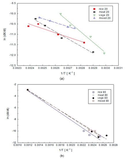 In this study, the Friedman method was used to determine the activation energy (E) and the frequency factor (A) in the pyrolysis of food wastes. Figure 7 shows how the activation energy can be calculated from the conversion rate ln(dX/dt) and 1/T in Equation (6).
