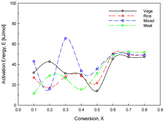 Figure 8 shows the activation energy distribution when the conversion in the pyrolysis reaction of foods was 10–80%, using the method previously described. Pyrolysis is an endothermic reaction, the activation energy of which increases with increasing conversion of foods. This relationship is due to the pyrolysis of the polymeric compound from the main chain in the region where the binding energy is relatively weak at the initial stage of the pyrolysis reaction followed by gradual pyrolysis of the main chain with time for pyrolysis of the biomass. The activation energy of the compound showed a greater variability than a single substance. It is interpreted as a result of synergy between different substances [31,32]. However, as the conversion rate increased to over 60%, the activation energy increased to 50 kJ/mol. Generally, the activation energy range of biomass is 30–200 kJ/mol and in case of laminarin, which is the main component of carbohydrate, has 53 kJ/mol by using the Friedman method. The DTG graph was shown in Figure 6 according to the food waste characteristics. Although each material is represented by different peaks, most materials contained a carbohydrate peak. This means the main composition of food waste is carbohydrate. Additionally, the activation energy shows a lower value than other papers, because food waste consists of carbohydrates and other substances rather than cellulose, hemicellulose, and lignin [33,34].
