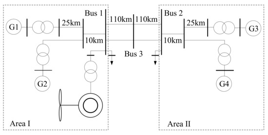 The structure of the test system is shown in Figure 1 [15,16]. Both Area I and Area II have two synchronous generators installed. All four of the synchronous generators are identical with rated power of 900 MW and equipped with turbine governors. A PSS on generator 1 is considered in this study. The DFIG based wind farm is connected to bus 1 in area I. The wind farm is represented by one aggregated DFIG. The parameters of DFIG, synchronous generators and control blocks of turbine governor can be found in Appendix A. For the studied system, the penetration rate of wind power is considered to be 10% under rated output [15], and the size of wind farm is determined based on that. However, lower or higher penetration levels of wind power can also be considered without losing the generality of this study.