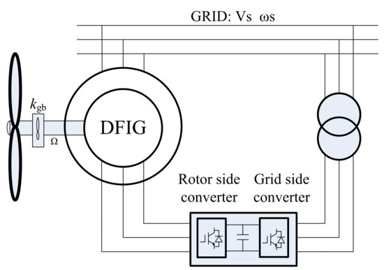 In this paper, a grid-connected DFIG is considered. The proposed control scheme for DFIG will help damp the inter-area oscillation while its dynamics are considered in detecting the lead leg phase in a control scheme. In particular, the model of DFIG consists of aerodynamic, turbine shaft dynamic, DFIG machine dynamic, RSC, GSC and control systems of the converters. In particular, the dynamic model of the DFIG includes the DC link capacitor dynamic and converter transients that are modeled in detail in this paper, while they are usually not considered in other studies [5,11]. The topology of the DFIG-based wind energy conversion system is shown in Figure 2. The detailed models of its components are briefly given below.
