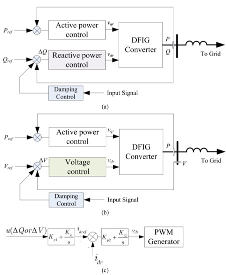 The reactive power control and voltage control are achieved by using two PI control loops, as shown in Figure 3c, which are commonly used for DFIG reactive power modulation [9,12,18].